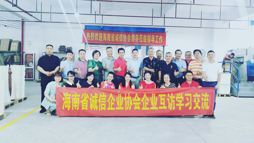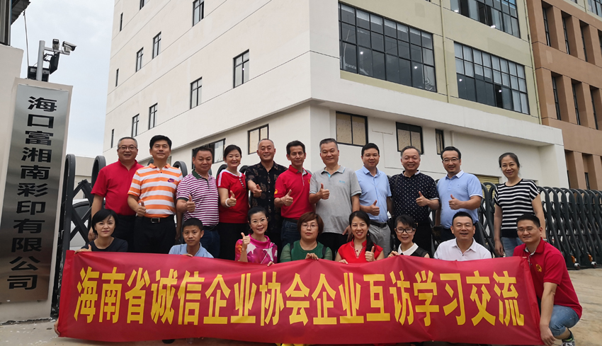 2019年5月25日下午,海南省誠信企業協會高級顧問:蔡澤進、何東海,會長孫秀山,講師:廖勇、黃妮,副會長:肖輔林、朱學寧,秘書長林華杰、常務副秘書長傅姝暢攜同會員單位代表一行,蒞臨海誠協副會長單位海口富湘南彩印有限公司(以下簡稱:富湘南)參觀交流,深入了解富湘南的印刷工藝、企業文化、誠信建設、運營方式和發展歷程。此次企業互訪活動吸引了二十幾家企業代表參加。