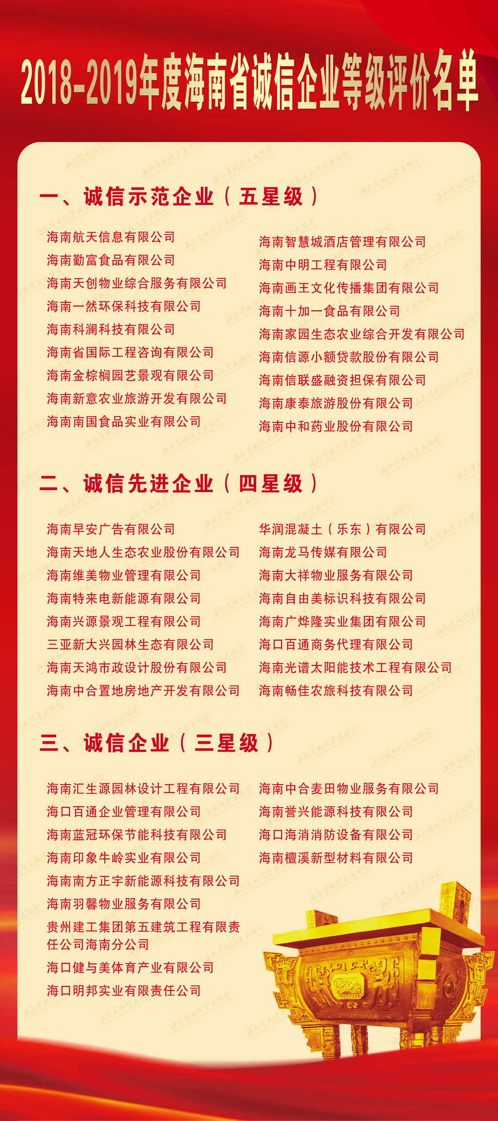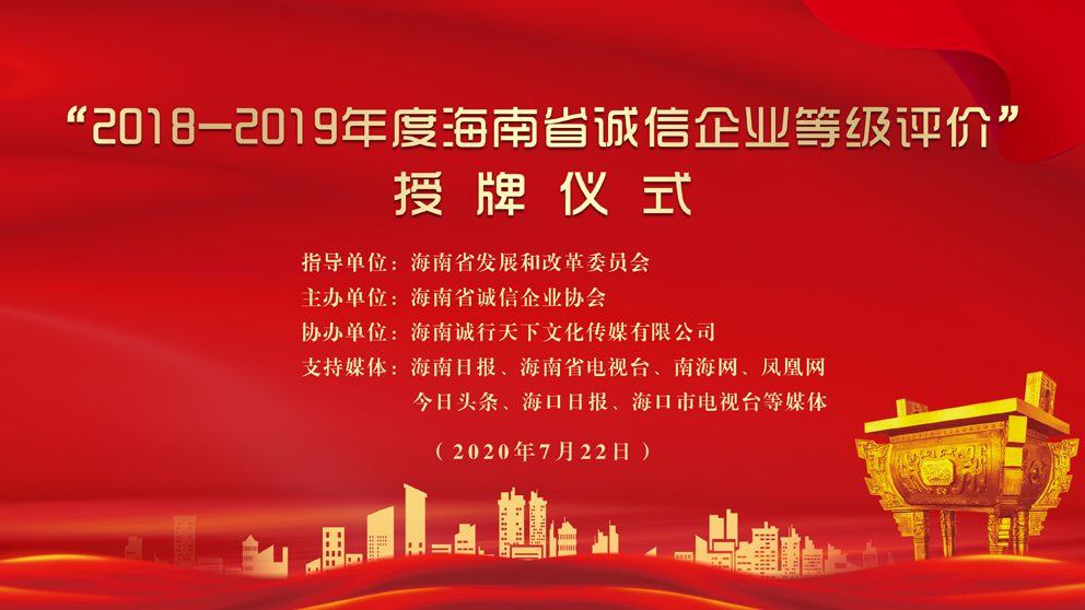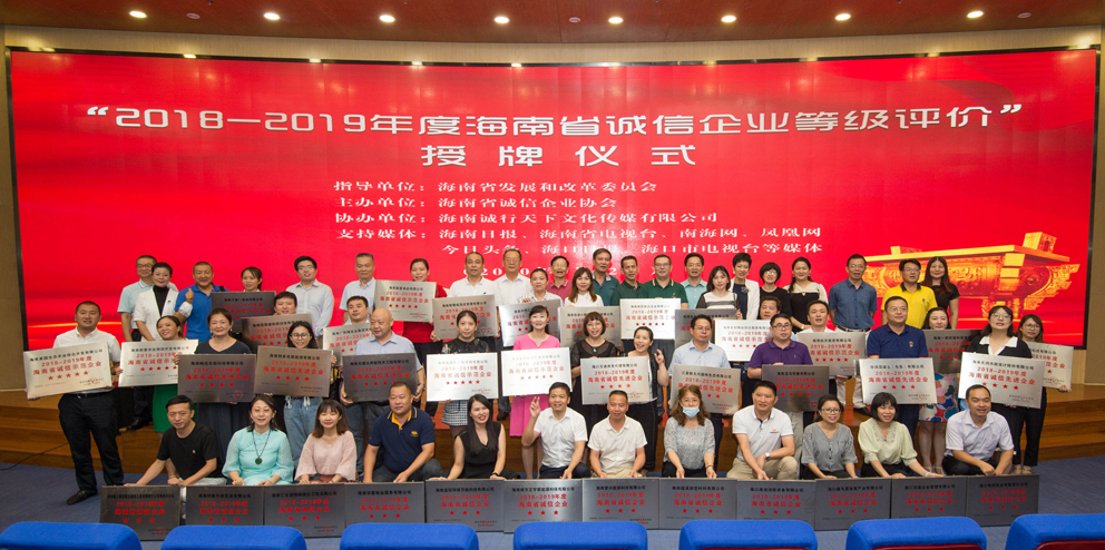 7月22日,由海南省發(fā)改委等政府部門指導(dǎo),海南省誠信企業(yè)協(xié)會主辦、海南誠行天下文化傳媒有限公司協(xié)辦的“2018-2019年度海南省誠信企業(yè)等級評價(jià)”授牌儀式在海口市民游客中心隆重舉行。