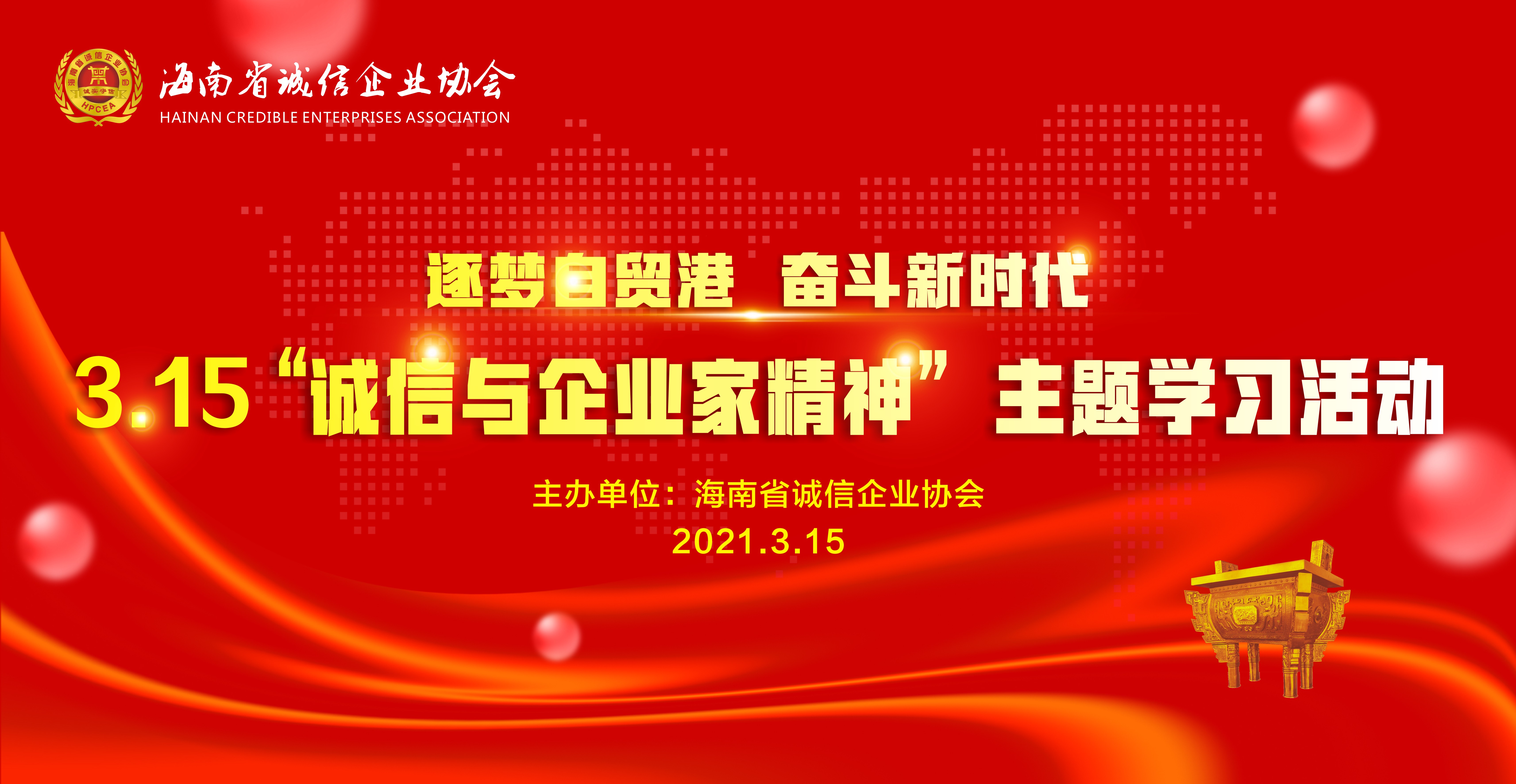3月15日,由海南省誠信企業(yè)協(xié)會主辦的逐夢自貿(mào)港、奮斗新時代—315“誠信與企業(yè)家精神”主題學習活動在海口賽侖吉地酒店隆重舉行,活動特邀勵志教育專家、瓊臺師范學院客座教授符江老師和海南省新聞工作者協(xié)會副主席、中國蘇軾研究學會副秘書長李公羽做主題演講。
