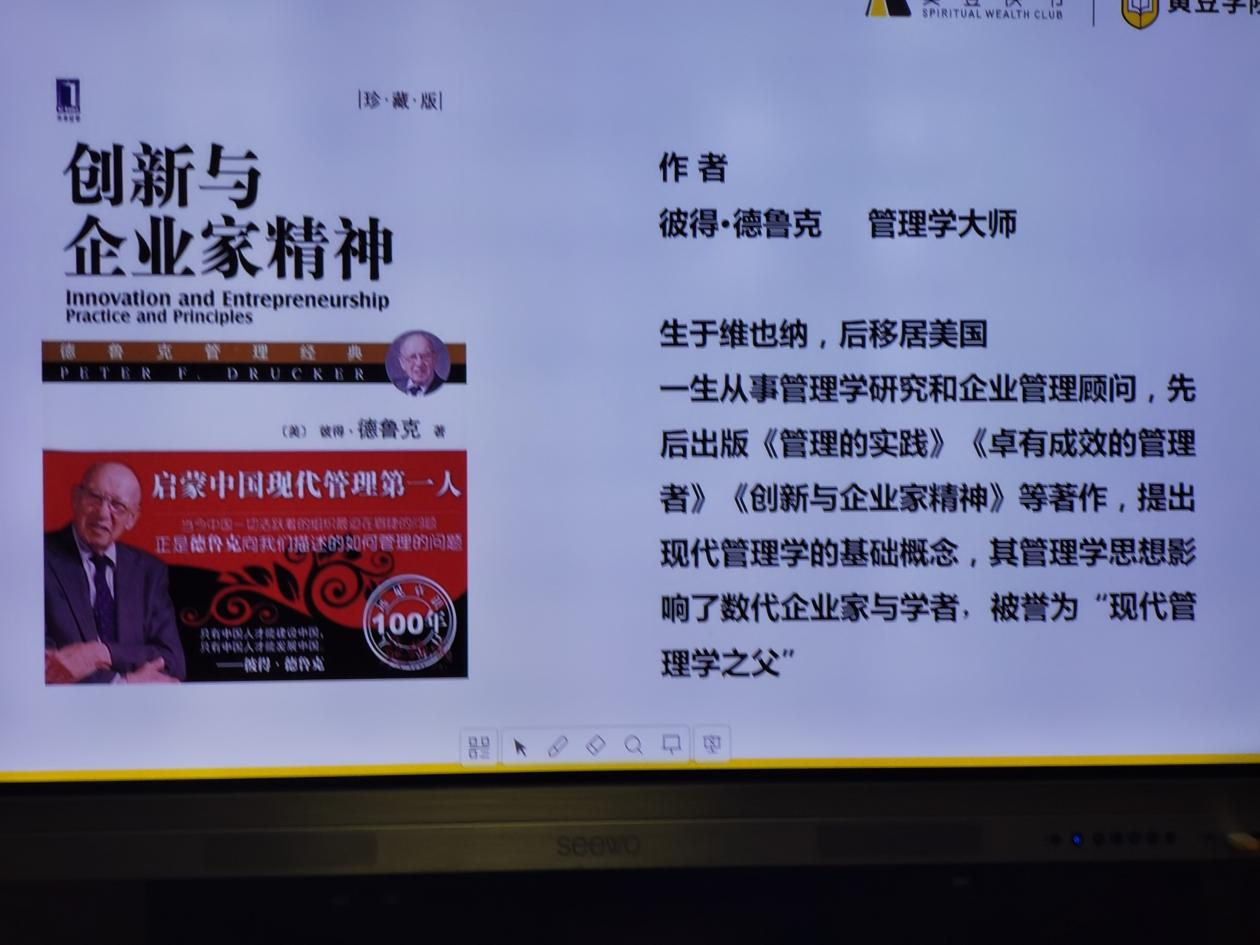 在座的十幾位企業家朋友共同分享了書籍《創新與企業家精神》,本書作者者彼得·德魯克 ,管理學大師一生從事管理學研究和企業管理顧問,提出現代管理學的基礎概念,其管理學思想影響了數代企業家與學者,被譽為“現代管理學之父”。