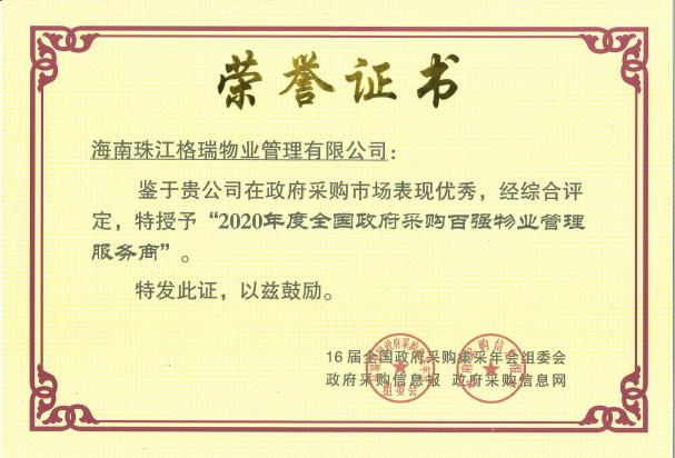 2010年獲國家一級物業服務企業資質,2016年評為海南省物業行業前10強企業,2017年榮膺海南省物業行業唯一的省級誠信示范企業,2018年成為全國物業行業百強企業,并連續三年蟬聯進位百強榜單。2020年當選海南省物業管理協會第五屆“常務副會長單位”,榮膺“2020年度全國政府采購百強物業管理服務商”稱號。