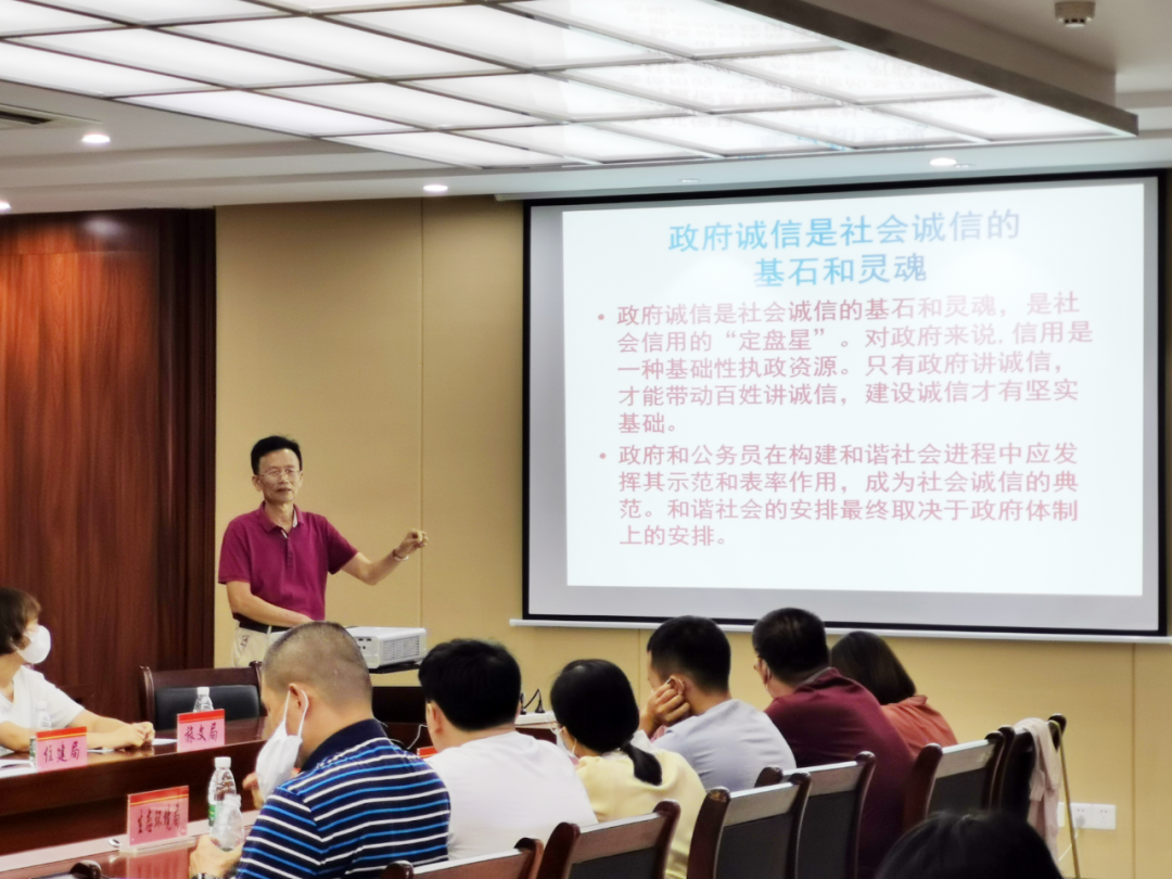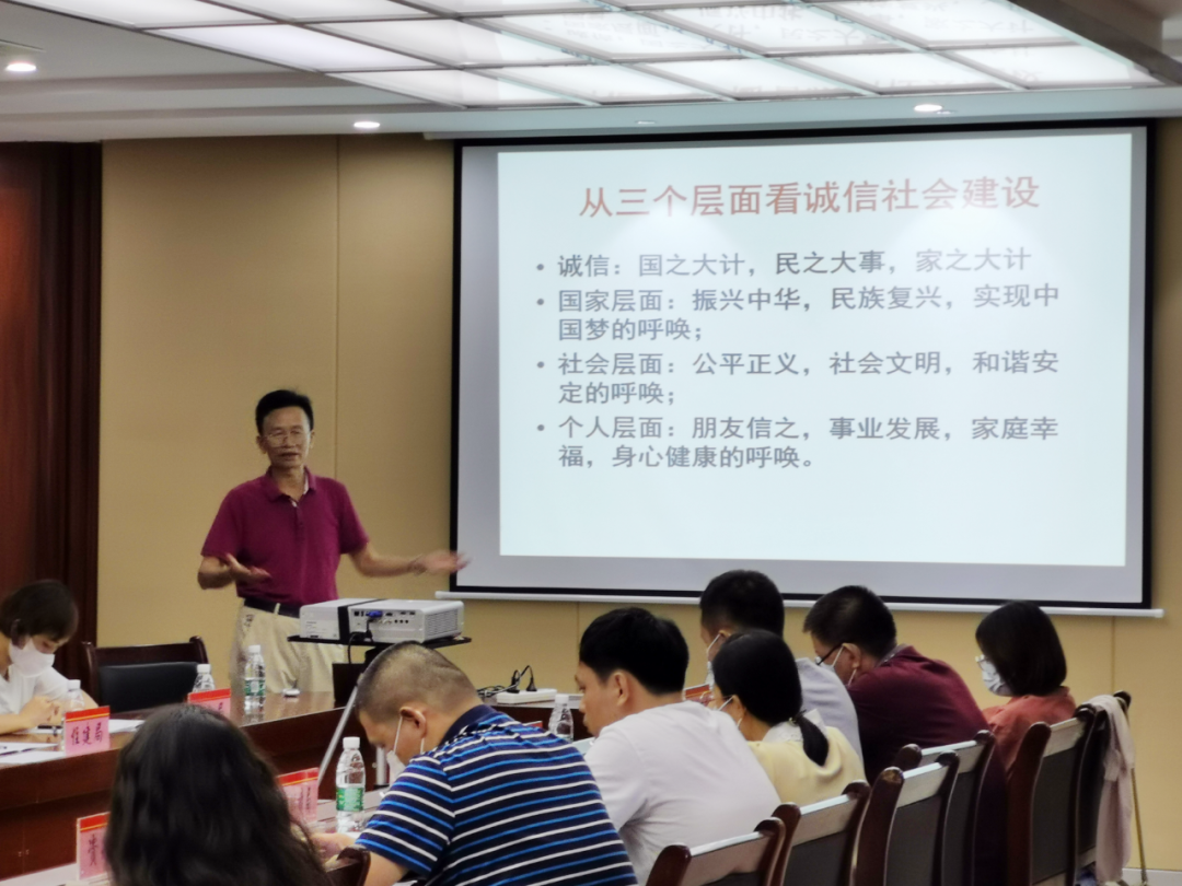 29日下午第一講由省誠信企業協會講師團講師、海南勵志教育專家符江老師講授《政府干部要做弘揚誠信美德,建設誠信社會的踐行者與推動者》專題講座,首先從古今中外誠信故事,講述誠信是人類的共同美德,闡誠信的意義與價值,建設誠信社會,打造誠信政府,政府干部更要當先鋒做表率,扎實推進信用建設工作,助手打造海南自貿易港國際化、法治化、便利化營商環境,推動海南自貿港高質量發展。
