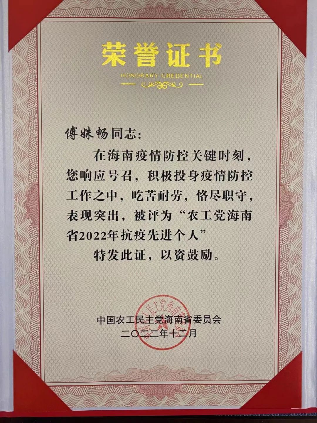 12月15-16日,傅姝暢秘書長參加農(nóng)工黨海南省2022年專委會(huì)聯(lián)席會(huì)議暨參政議政工作培訓(xùn),并被評(píng)為“農(nóng)工黨海南省2022年抗擊疫情先進(jìn)個(gè)人”;